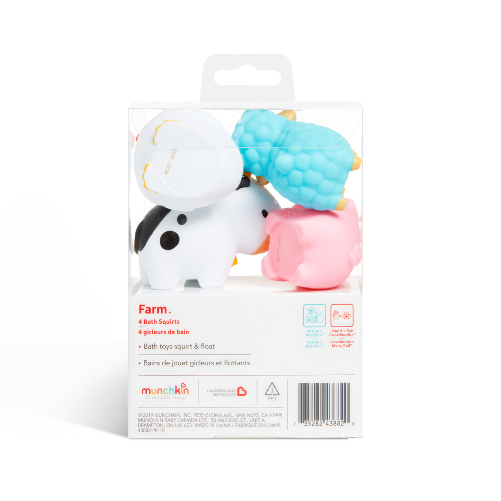Découvrez les jouets aspergeurs ferme 4 pcs de Munchkin, l’ensemble parfait pour transformer le bain en une aventure joyeuse et éducative pour votre bébé ! 🐷🐔🦆🐄 Ces jouets aspergeurs ferme sont faciles à presser. De plus, ils libèrent des jets d’eau amusants, captivant l’attention de l’enfant.
