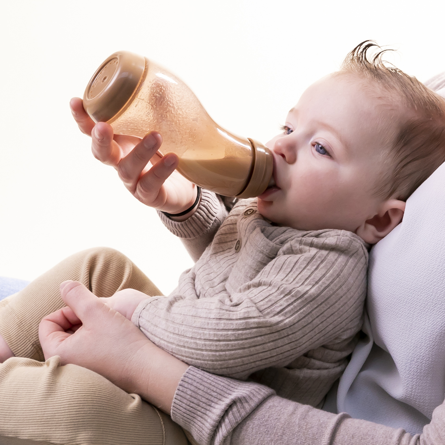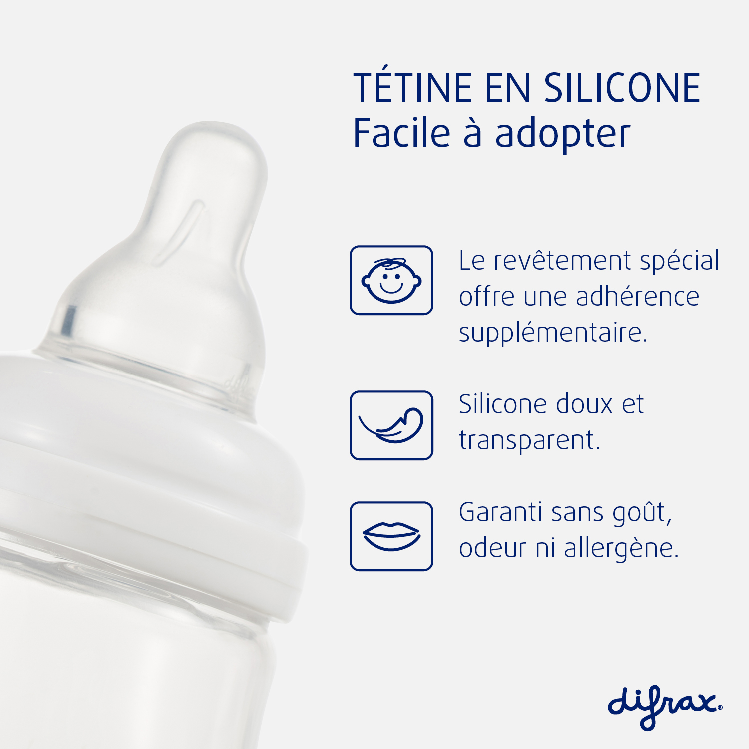 Nous fabriquons ce biberon en verre borosilicate, un matériau de haute qualité. Le verre est naturellement hygiénique, durable et ne retient ni odeur ni goût. La tétine, en silicone doux, est conçue pour imiter la forme du sein maternel. Ceci facilite la transition entre le sein et le biberon, particulièrement pour l’allaitement mixte.