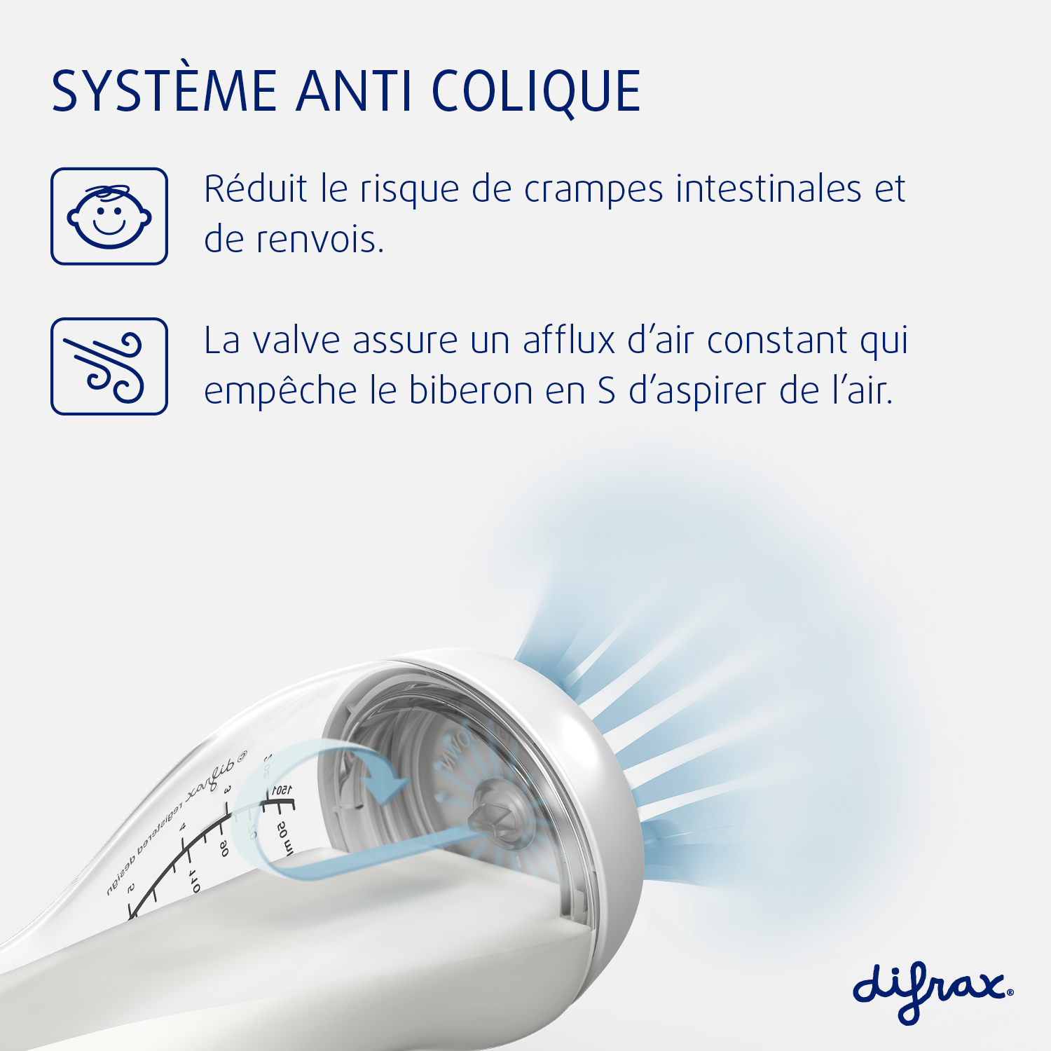 Les biberons S anti-colique ont un système anti-colique breveté dans le fond, qui permet d’éviter les crampes intestinales, les rots et les rejets. Grâce à la valve et la forme unique en S, la nourriture et l’air ne se mélangent plus. Ainsi, les nutriments et les vitamines C, A et E sont conservés de manière optimale.