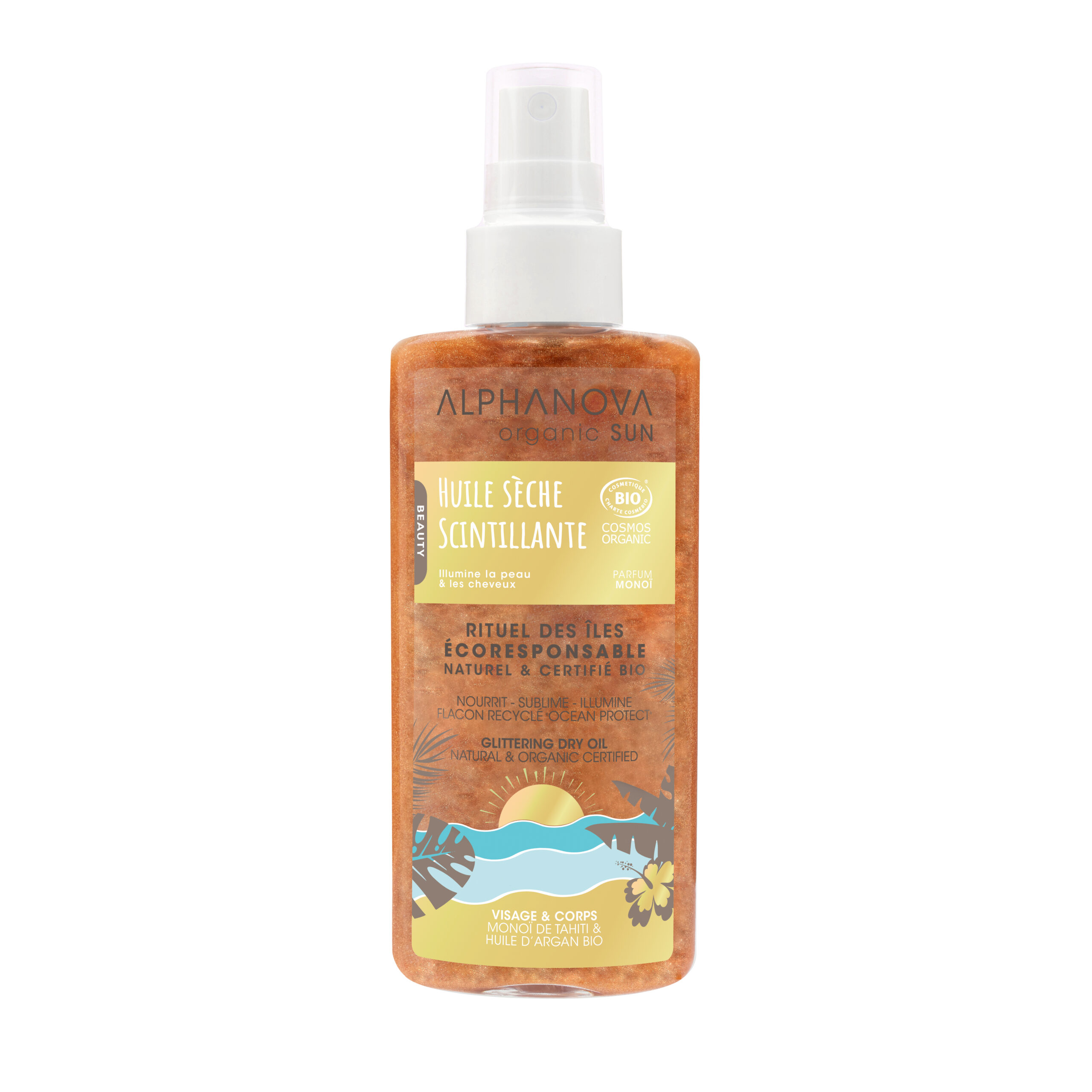 Huile Sèche Scintillante Après-Soleil au Monoï de Tahiti Alphanova Sun : Le Secret d’un Bronzage Éclatant ! ✨
